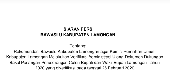 Rekomendasi Bawaslu Kabupaten Lamongan agar Komisi Pemilihan Umum Kabupaten Lamongan Melakukan Verifikasi Administrasi Ulang Dokumen Dukungan Bakal Pasangan Perseorangan Calon Bupati dan Wakil Bupati Lamongan Tahun 2020 yang diverifikasi pada tanggal 28 Februari 2020